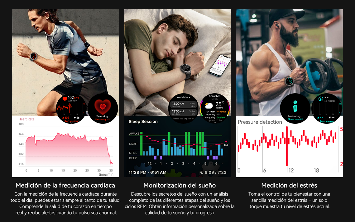 - 24/7 Health Guardian- Monitoreo en tiempo real de la frecuencia cardíaca, el oxígeno en sangre y el estrés para alertas de seguridad.